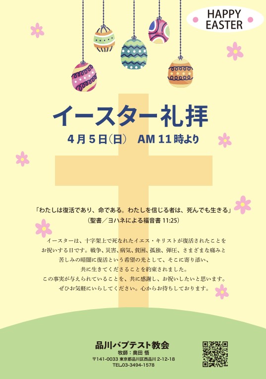 品川バプテスト教会では、このイースターを記念して特別な集会を行います。どなたでもご参加いただけるあたたかなひとときで、賛美やメッセージを通して、初めての方にもわかりやすくイースターの意味をお伝えします。心を静め、神様の愛と希望に触れる時間となれば幸いです。